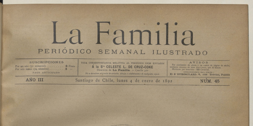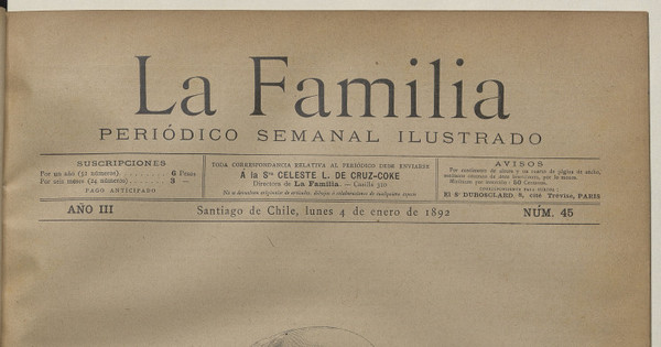 La Familia. Santiago: Imprenta Cervantes, 1890-1892, año II, número 45 (4 de enero de 1892), páginas 168-169; número 47 (18 de enero de 1892), página 184