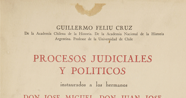 Incluye dedicatoria: A la inspiradora memoria de Enrique Matta Vial. 1868-1922. Historiógrafo. Fundador de la "Colección de Historiadores y de Documentos relativos a la Independencia de Chile", 1900-1965. Homenaje al cumplirse los sesenta y cinco años de la publicación. G. F. C. 1965.