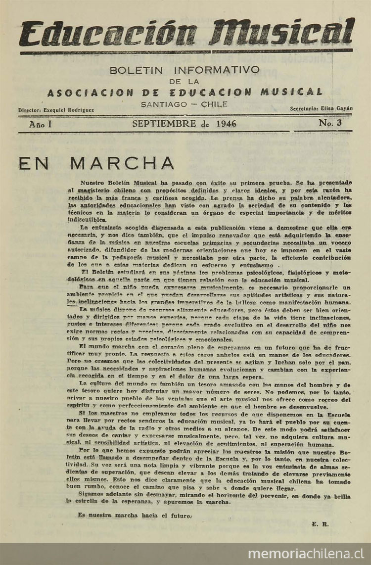 Educación musical : boletín informativo de la Asociación de Educación Musical. Santiago : La Asociación, 1946-1950. 5 volúmenes, número 3, (septiembre 1946)