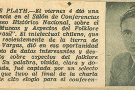 Noticia sobre conferencia dictada por Oreste Plath, “Museos y Aspectos del folklore en el Brasil”, realizada en el Salón de Conferencias del Museo Histórico Nacional el 4 de agosto de 1944