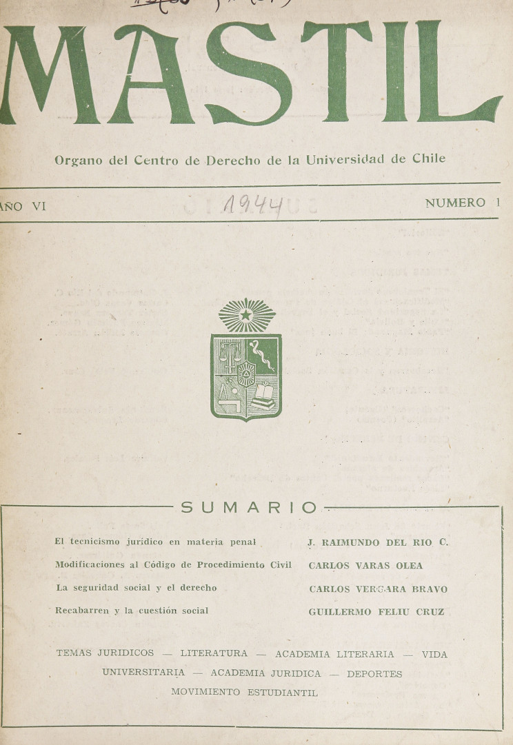 Mástil. Santiago: Centro de Estudiantes de Derecho de la Universidad de Chile, 1929-1955, 20 volúmenes. Año VI, número 1 (mayo de 1944)