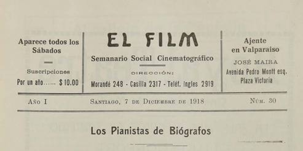 El Film. Santiago : [s.n.], 1918-1919. 1 volumen, año 1, número 30, (7 diciembre 1918)
