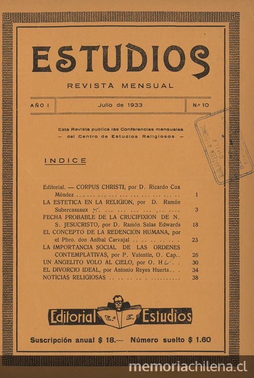 Estudios. Santiago : [Editorial no identificada], 1932-1957. 25 volúmenes, año 1, número 10, (julio 1932)