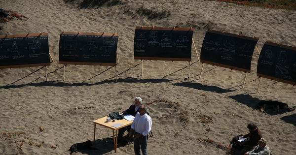 Alberto Cruz C. junto al poeta Carlos Covarrubias en un Taller de Amereida, en las dunas de la Ciudad Abierta