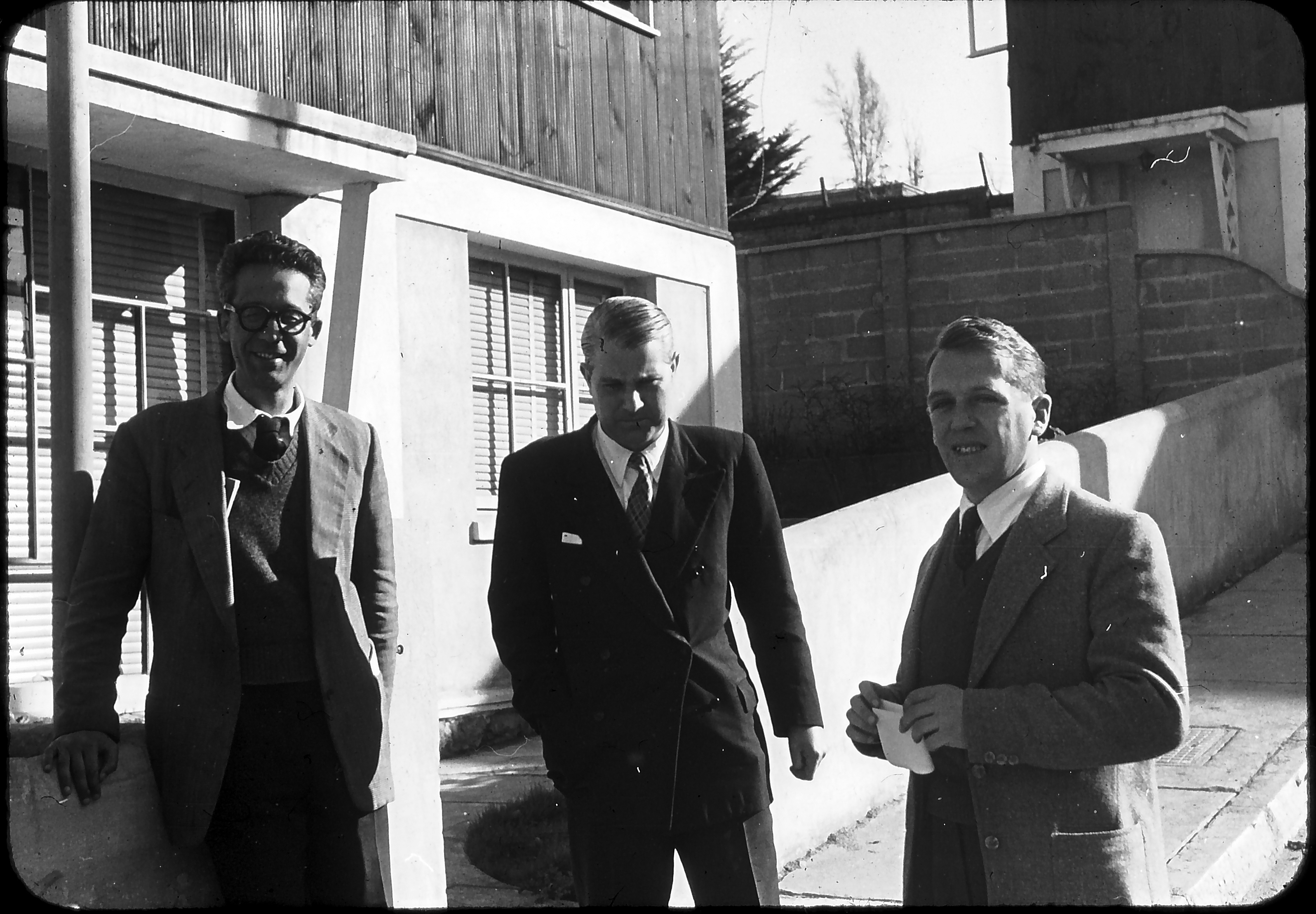 Alberto Cruz C., Carlos Bresciani Bagattini y Arturo Baeza en el pasaje Balmaceda, donde vivían Cruz y Baeza en Cerro Castillo, Viña del Mar
