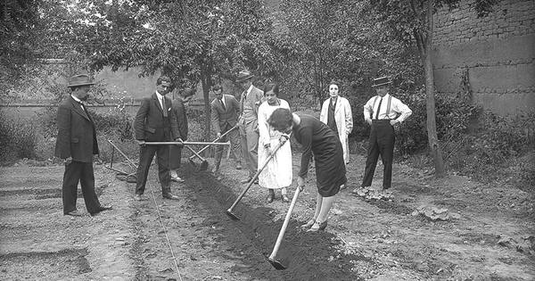 Grupo de hombres y mujeres trabajando en un huerto en San Bernardo, 1925