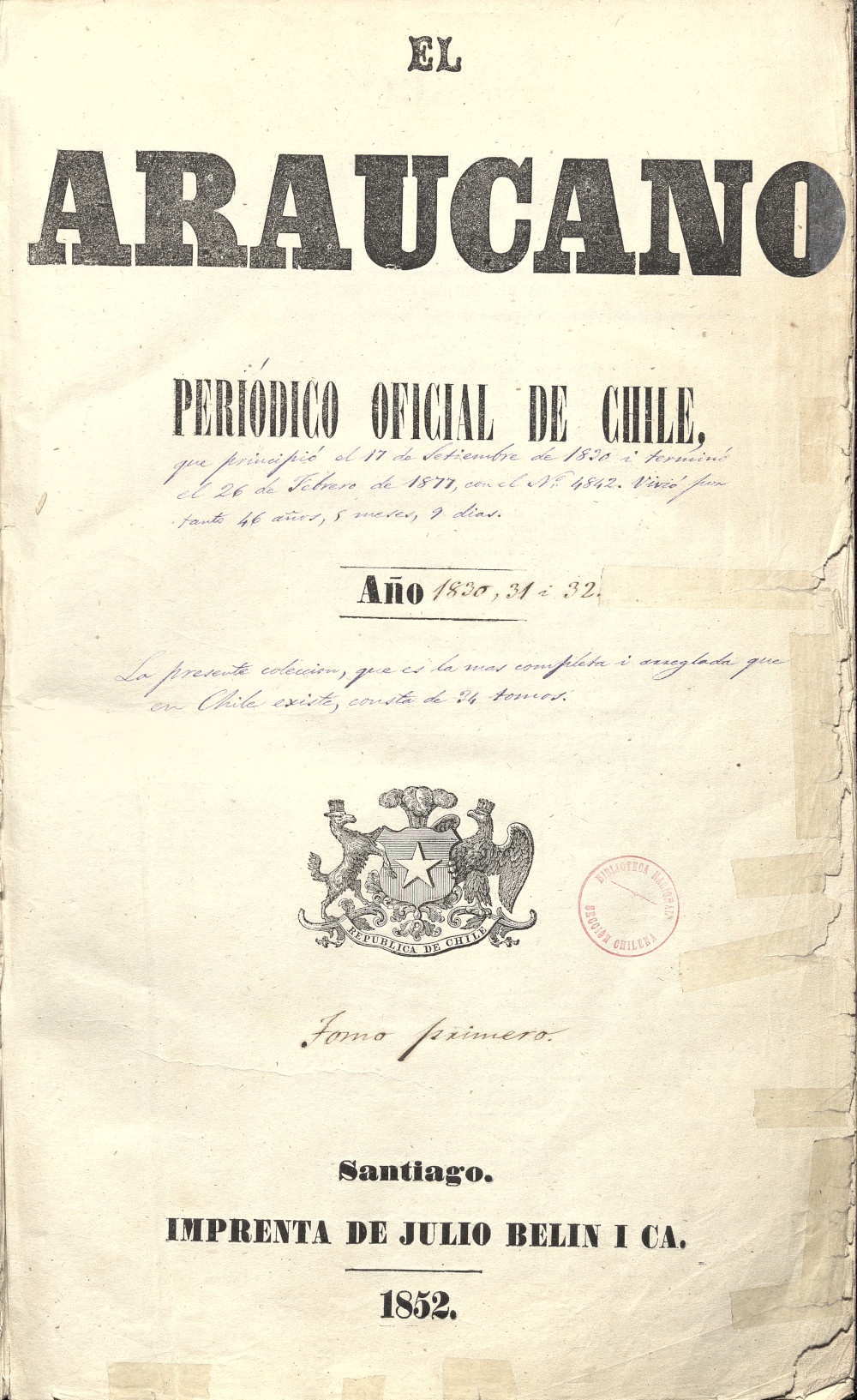 El Araucano. Santiago de Chile : Impr. de la Opinion, 1830-1877. 48 v. ; 20-45 cm.