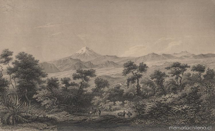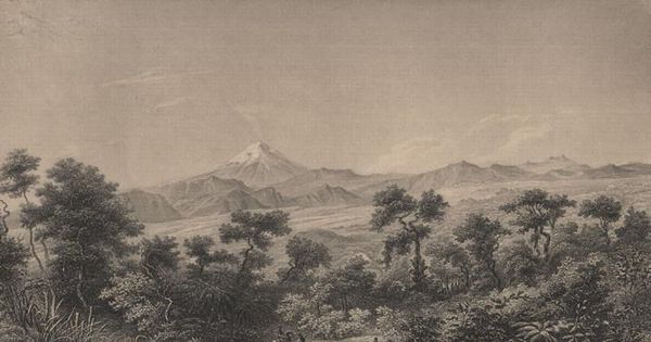 The region of oaks between Ialapa and Quautepec looking towards the Volcano of Orizava, 1840