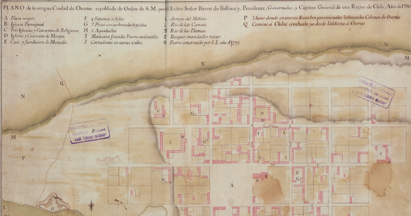 Plano de la antigua ciudad de Osorno repoblada de orden de S. M. por el Baron de Ballinary, presidente, governador y capitán general de este Reyno de Chile, año del 1796