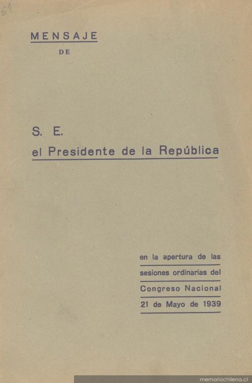 Mensaje de S. E. el Presidente de la República en la apertura de las sesiones ordinarias del Congreso Nacional. [Santiago : s.n.], impresión de 1939-1941 (Santiago : Impr. Fiscal de la Penitenciaría) v.