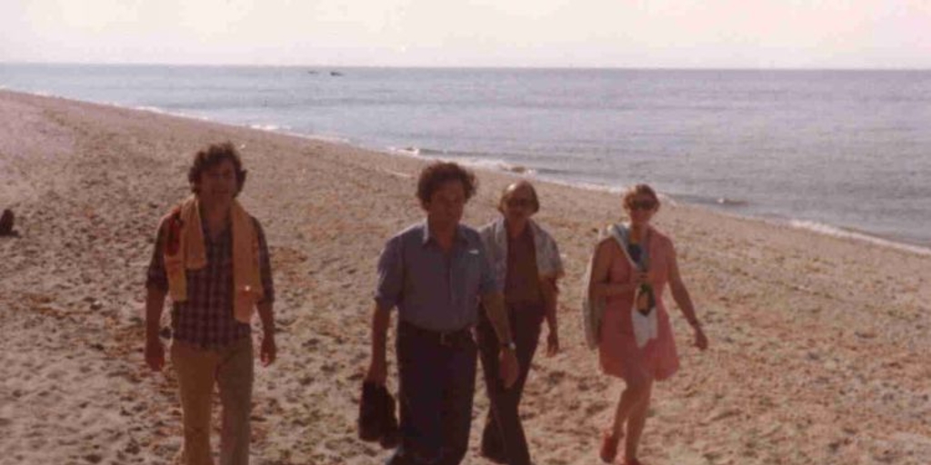 Enrique Lihn junto a Óscar Hahn, Conie Domínguez y Pedro Lastra en la playa, hacia 1960