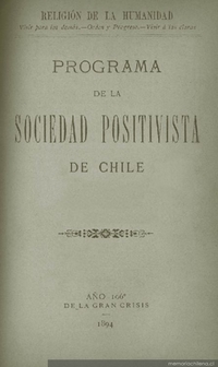 Programa de la sociedad positivista de Chile. Santiago :Ed. Ercilla,1894. 7 p. ;18 cm.