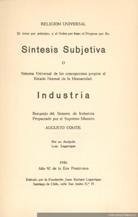 Síntesis subjetiva, o, Sistema universal de las concepciones propias al estado normal de la humanidad. Industria : bosquejo del sistema de industria proyectado por el Supremo Maestro Augusto Comte. Santiago de Chile :Fundación Juan Enrique Lagarrigue,1946. 271 p. ;22 cm.