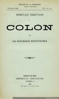 Homenaje tributado a Colón en la Sociedad Positivista. Santiago de Chile :Impr. Cervantes,1892. 36 p. ;24 cm.