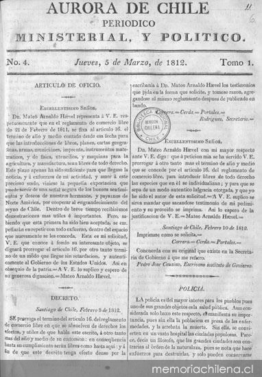 Aurora de Chile : periódico ministerial, y político. Santiago de Chile : Impr. de este Superior Gobierno, por los señores Samuel B. Johnston, Guillermo H. Burbidge y Simon Garrison, 1812-1813. 2 v. Tomo I, nº 4 (5 mar. 1812)