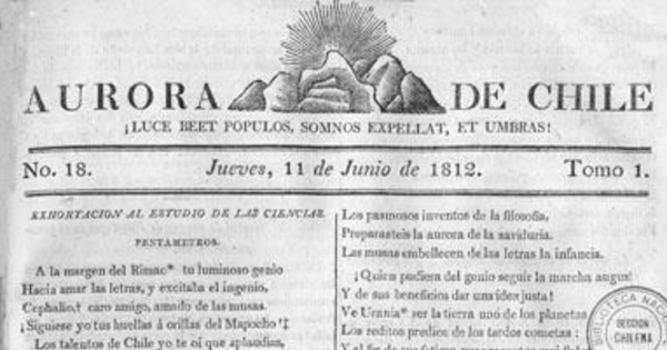 Aurora de Chile : periódico ministerial, y político. Santiago de Chile : Impr. de este Superior Gobierno, por los señores Samuel B. Johnston, Guillermo H. Burbidge y Simon Garrison, 1812-1813. 2 v. Tomo I, nº 18 (11 jun. 1812)