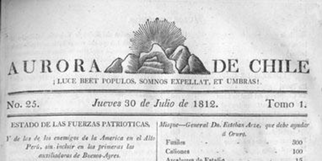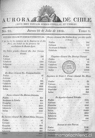 Aurora de Chile : periódico ministerial, y político. Santiago de Chile : Impr. de este Superior Gobierno, por los señores Samuel B. Johnston, Guillermo H. Burbidge y Simon Garrison, 1812-1813. 2 v. Tomo I, nº 25 (30 jul. 1812)