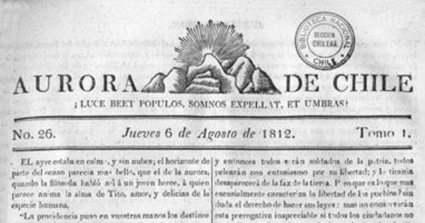 Aurora de Chile : periódico ministerial, y político. Santiago de Chile : Impr. de este Superior Gobierno, por los señores Samuel B. Johnston, Guillermo H. Burbidge y Simon Garrison, 1812-1813. 2 v. Tomo I, nº 26 (6 ago. 1812)