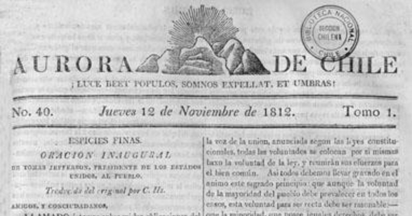 Aurora de Chile : periódico ministerial, y político. Santiago de Chile : Impr. de este Superior Gobierno, por los señores Samuel B. Johnston, Guillermo H. Burbidge y Simon Garrison, 1812-1813. 2 v. Tomo I, nº 40 (12 nov. 1812)