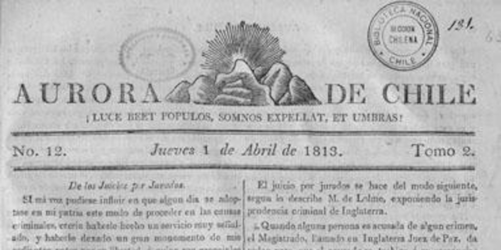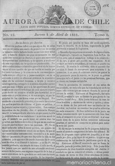 Aurora de Chile : periódico ministerial, y político. Santiago de Chile : Impr. de este Superior Gobierno, por los señores Samuel B. Johnston, Guillermo H. Burbidge y Simon Garrison, 1812-1813. 2 v. Tomo 2, nº 12 (1 abr. 1813)