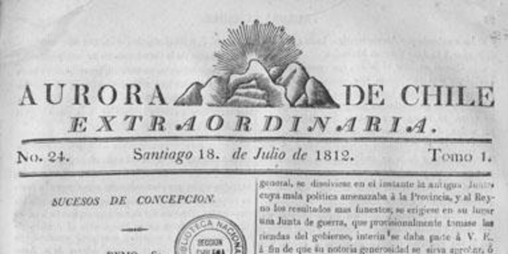 Aurora de Chile : periódico ministerial, y político. Santiago de Chile : Impr. de este Superior Gobierno, por los señores Samuel B. Johnston, Guillermo H. Burbidge y Simon Garrison, 1812-1813. 2 v. Tomo 1, nº extraordirario (18 jul. 1812)