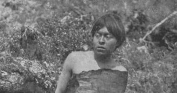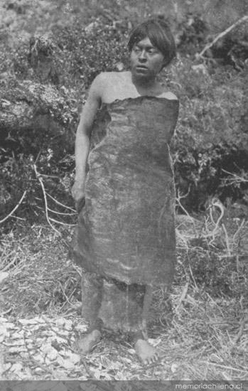 Mujer kawéskar con abrigo de piel de foca, hacia 1920