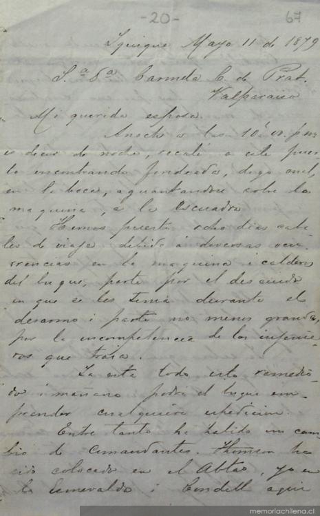 Iquique, 11 de mayo 1879 : carta de Arturo Prat a Carmela Carvajal