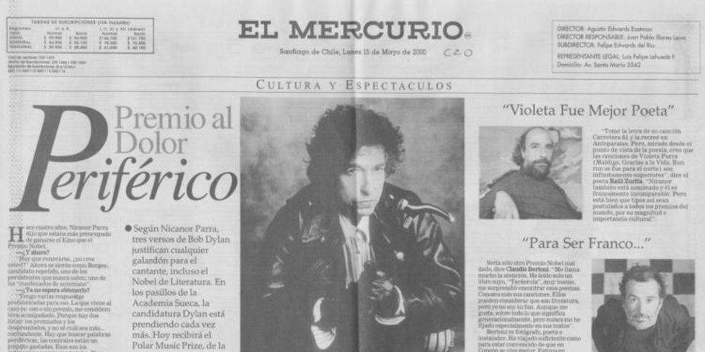 El Mercurio. Santiago : Talleres El Mercurio, 1900- Av. Santa María 5542, Santiago, Chile. Fono: 2287048. v. (15 mayo 2000)