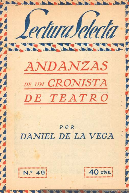 Andanzas de un cronista de teatro / por Daniel de la Vega. Santiago de Chile : [Imprenta Sociedad Boletín Comercial Salas & Compañía], 1927. 30 páginas