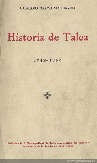 Historia de Talca : 1742-1942 / Gustavo Opazo Maturana. Santiago : Impr. Universitaria, 1942. 392 p.