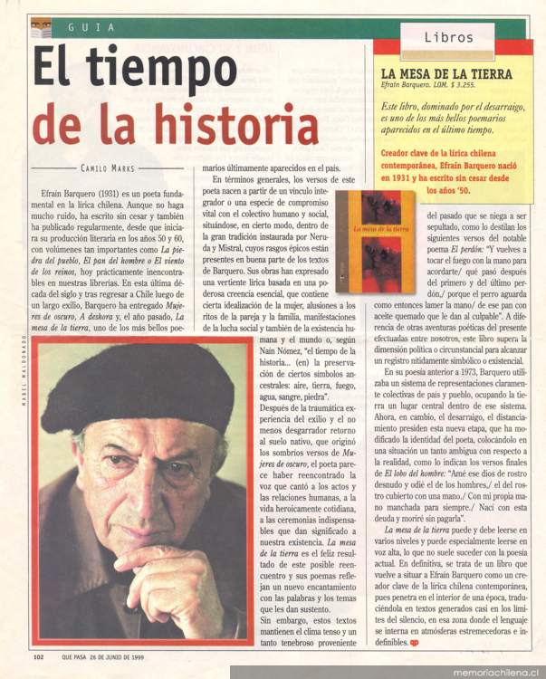Qué Pasa. Santiago : Segunda Ed. Portada, 1971- (Santiago : Edit. Antártica) v., n° 1472, (26 jun. 1999), p. 102