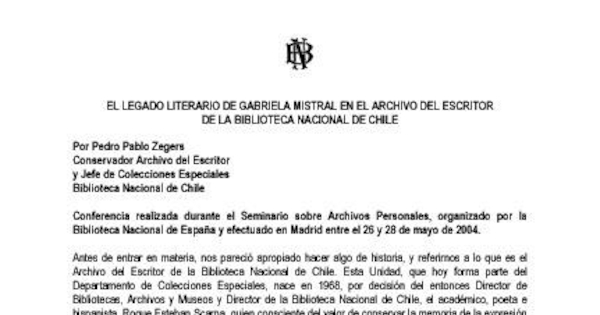 Conferencia realizada durante el Seminario sobre Archivos Personales, organizado por la Biblioteca Nacional de España y efectuado en Madrid entre el 26 y 28 de mayo de 2004