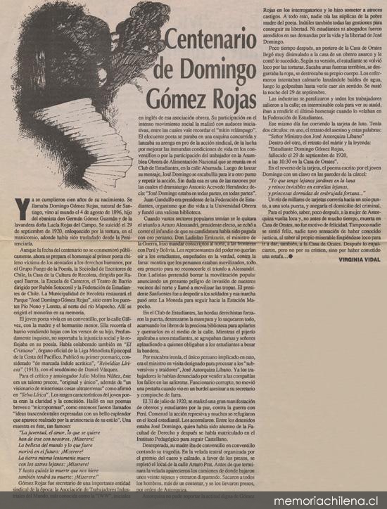 Materias: Federación de Estudiantes de la Universidad de ChileAutores Chilenos - Siglo 20 Gómez Rojas, José Domingo, 1896-1920