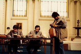 Los poetas Jaime Quezada y Floridor Pérez en el Salón Fundadores de la Biblioteca Nacional, hacia 1980