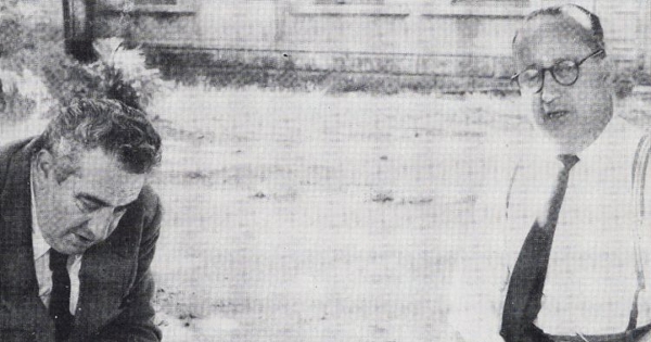 Daniel Belmar junto a Pablo de Rokha en la Escuela de Bellas Artes en Concepción, hacia 1961