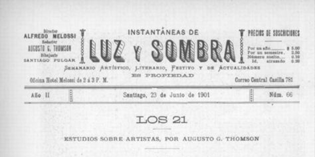 Instantáneas de luz y sombra : semanario festivo, literario, artístico y de actualidades. Santiago : [s.n.], 1900-1901 (Santiago : Impr. Barcelona) 2 v., n° 66 (23 jun. 1901) p. 3