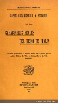 Sobre organización y servicio de los carabineros reales del reino de Italia : informe presentado al Estado Mayor del Ejercito por el adicto militar de Chile en Italia, mayor d. Otto Naschold. Santiago: Imprenta Nacional, 1927. 273 p.