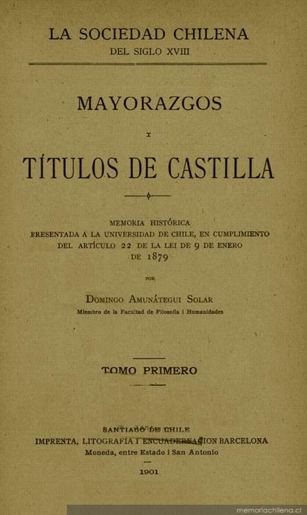Mayorazgos i Títulos de Castilla : memoria histórica presentada a la Universidad de Chile ... / por Domingo Amunátegui Solar. Santiago de Chile : Impr., Litogr. i Encuadernación Barcelona, 1901-1904. 3 v.