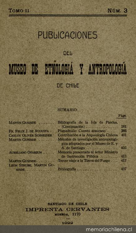 Publicaciones del Museo de Etnología y Antropología de Chile. Santiago : El Museo, 1917-1927 (Santiago : Universitaria) 4 v., tomo 2, n° 3, (1920), p. 417-436