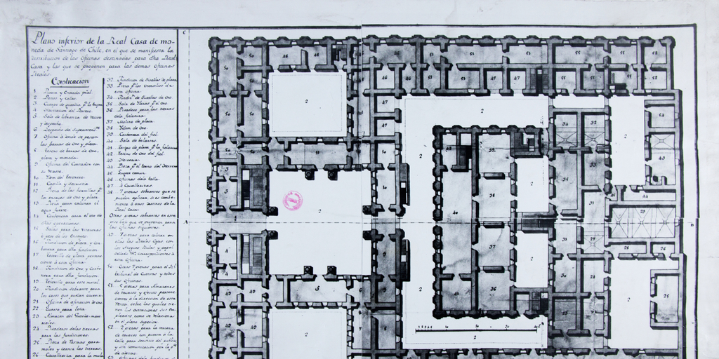 Plano inferior de la Real Casa de Moneda de Santiago de Chile, en el que se manifiesta la distribución de las oficinas destinadas para dicha Real Casa y las que se proponen para las demás oficinas Reales