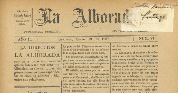 La Alborada. Valparaíso, Santiago : Impr. El Deber, 1905-1907. 42 nos., año II, n° 27, (13 ene. 1907)