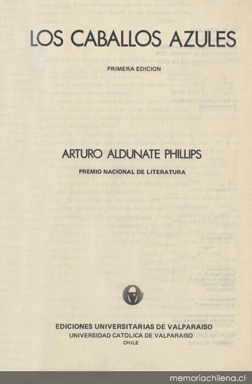 Los caballos azules / Arturo Aldunate Phillips. Valparaíso : Eds. Universitarias, c1977. 436 p., [32] p. de láms. col.
