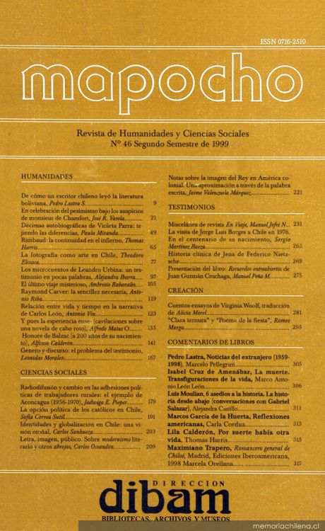 Mapocho / Biblioteca Nacional. Santiago : La Biblioteca, 1963- (Santiago : Universitaria) v., n° 46, (1999)