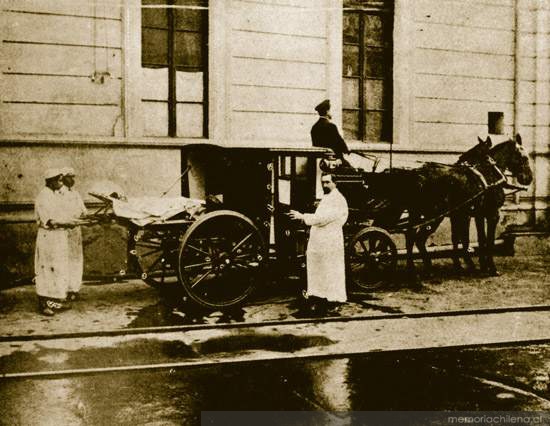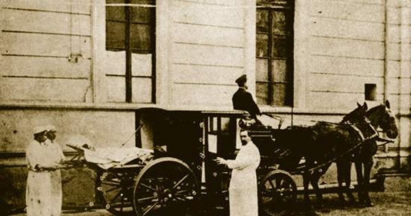 Introducción de enfermo en carruaje de ambulancia, hacia 1910