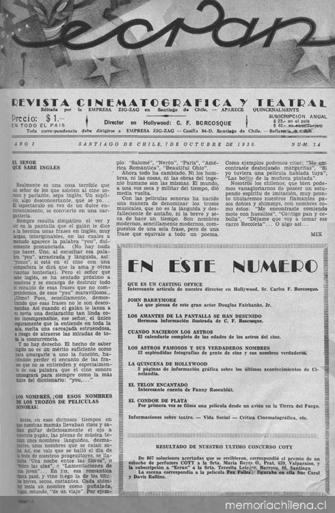 Ecran. Santiago : Empresa Editora Zig-Zag, 1930-1969. 39 v., n° 14, (7 oct. 1930)