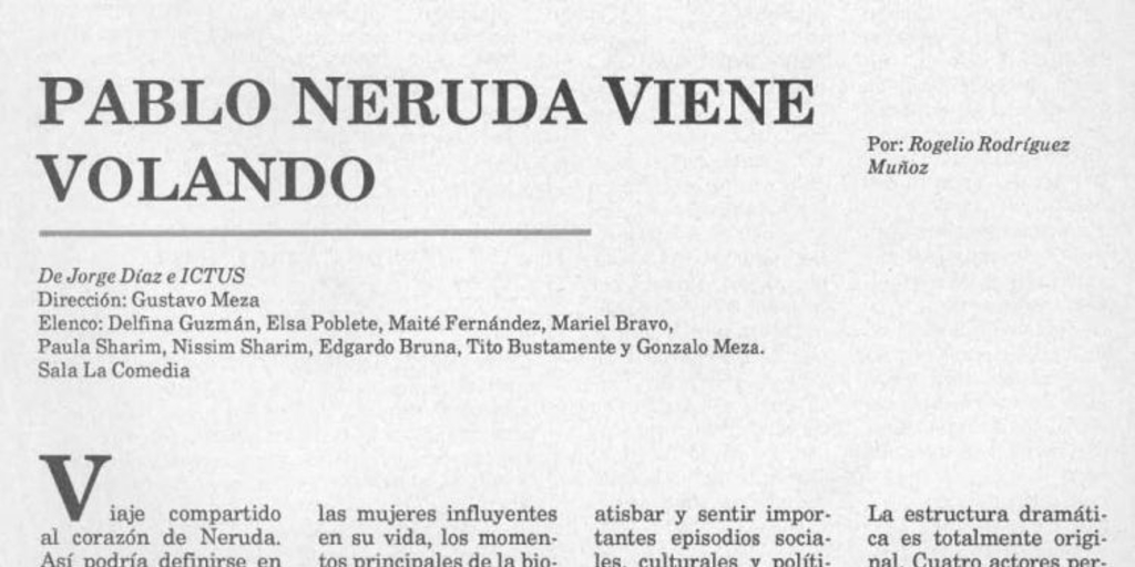 Materias: Neruda, Pablo, 1904-1973Díaz, Jorge, 1930- . Pablo Neruda Viene Volando