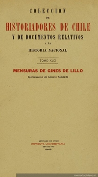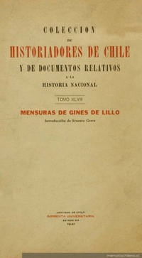 Mensura general de tierras de Ginés de Lillo : 1602-1605. Santiago :Universitaria,1941-1942. 2 v. ;28 cm.