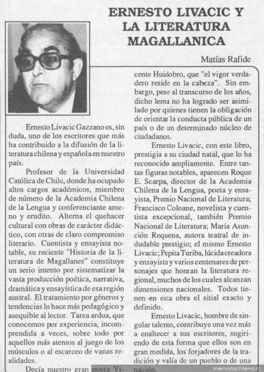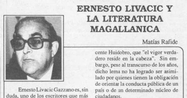 Materias: Livacic G., Ernesto, 1929- . Historia de la Literatura de Magallanes
