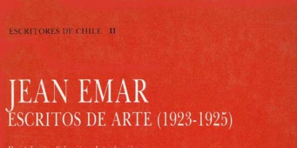 Jean Emar : escritos de arte (1923-1925) / recopilación, selección e introducción Patricio Lizama A. 1a. ed. Santiago : DIBAM, Centro de Investigación Diego Barros Arana, c1992 (Santiago : Universitaria) 170 p.