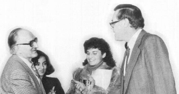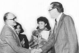 Hernán Millas recibiendo el Premio Nacional de Periodismo, lo saluda el Ministro de Educación Sergio Gaete Rojas, 1985